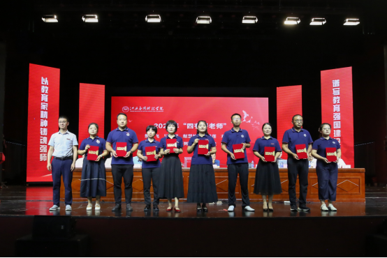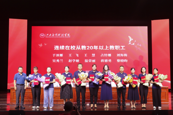 会上,与会校领导宣读各类表彰决定和连续在校从教20年以上教职工名单,并为获奖人员颁奖。