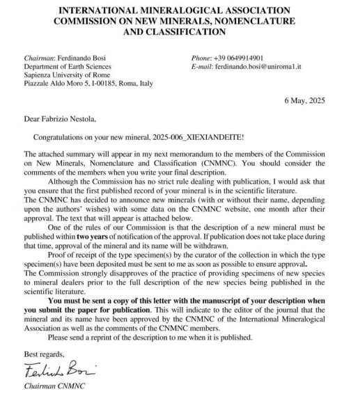 图1:国际矿物学协会新矿物命名和分类委员会主席费德里科·博西签发的批准通知书