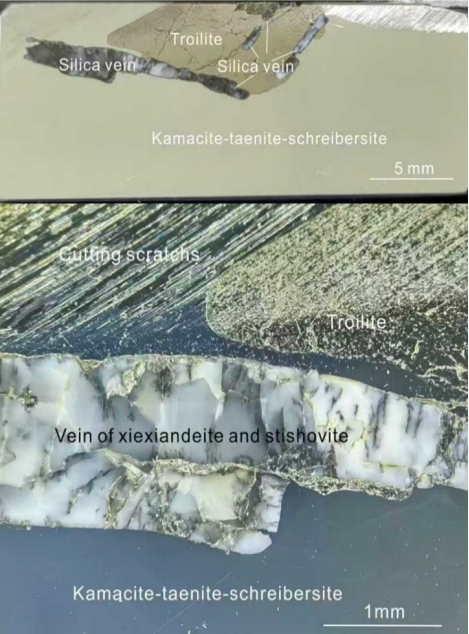 图2:铁纹石-镍纹石-陨磷铁矿和陨硫铁中的谢石英和斯石英的脉体