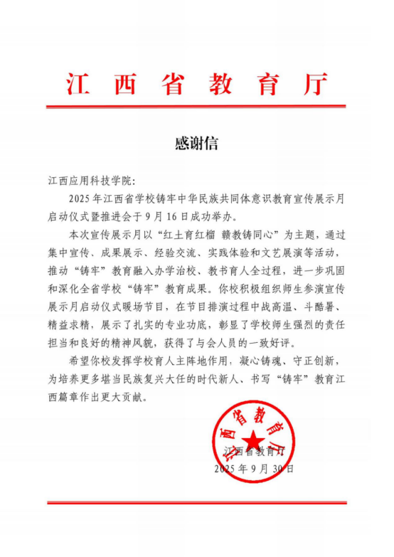 近日,学校收到省教育厅的感谢信,对我校师生在“2025年江西省学校铸牢中华民族共同体意识教育宣传展示月”启动仪式暨推进会中的出色表现予以高度肯定和诚挚感谢。