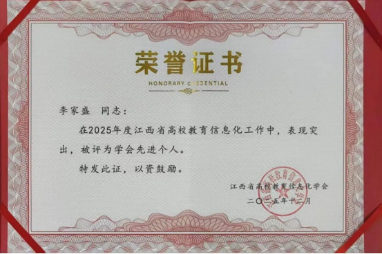 12月26日至27日,由江西省高校教育信息化学会主办的学术年会在赣州召开。会议对2025年度全省高校信息化工作中表现突出的单位和个人进行了表彰。我校凭借在智慧校园建设、数据治理和网络安全等方面的扎实成效,获评“2025年度江西省高校信息化工作先进单位”。同时,学校网络信息中心李家盛老师获评“2025年度江西省高校信息化工作先进个人”。