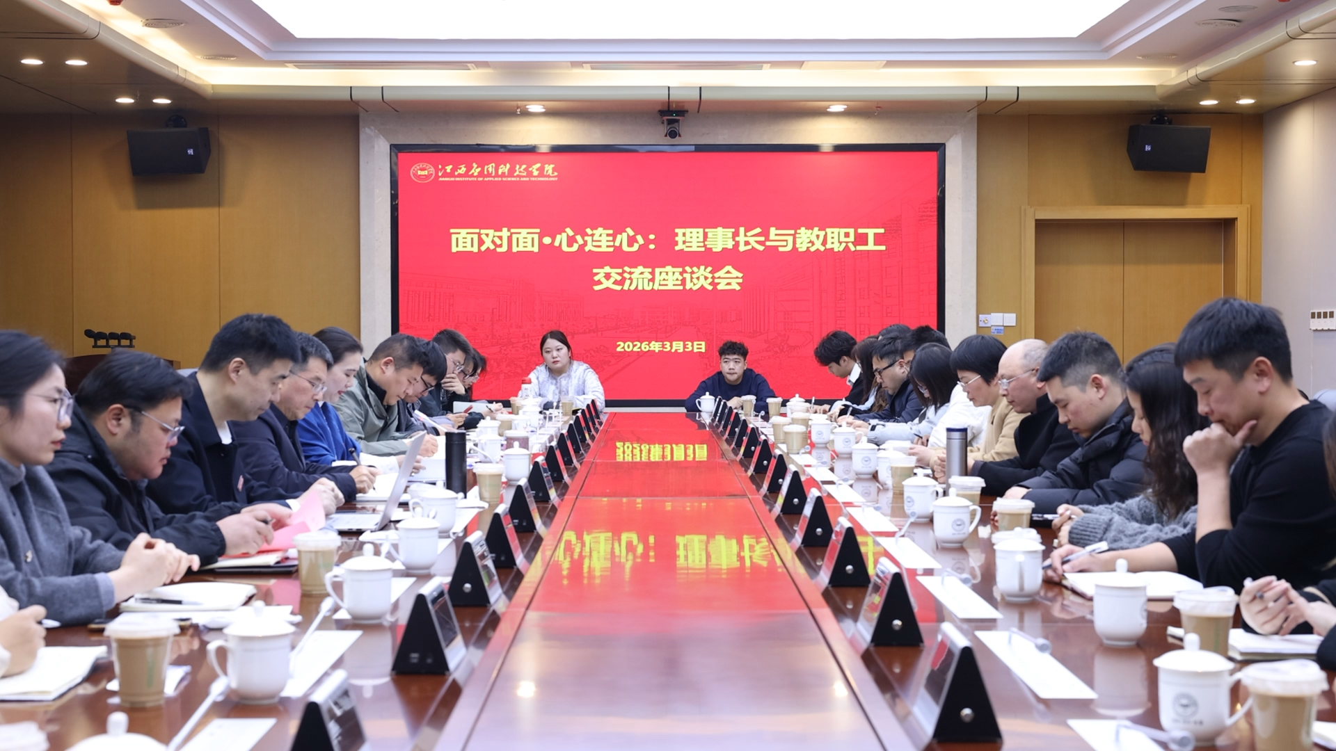 3月3日,正值元宵佳节,学校在三元大厦一楼会议室举行“面对面·心连心”理事长与一线教职工交流座谈会。学校理事长黄玉林与来自各学院、各部门的一线教职工代表欢聚一堂,共庆佳节、共话初心、共谋发展。常务副校长干甜主持座谈会,党委副书记江星出席座谈会。