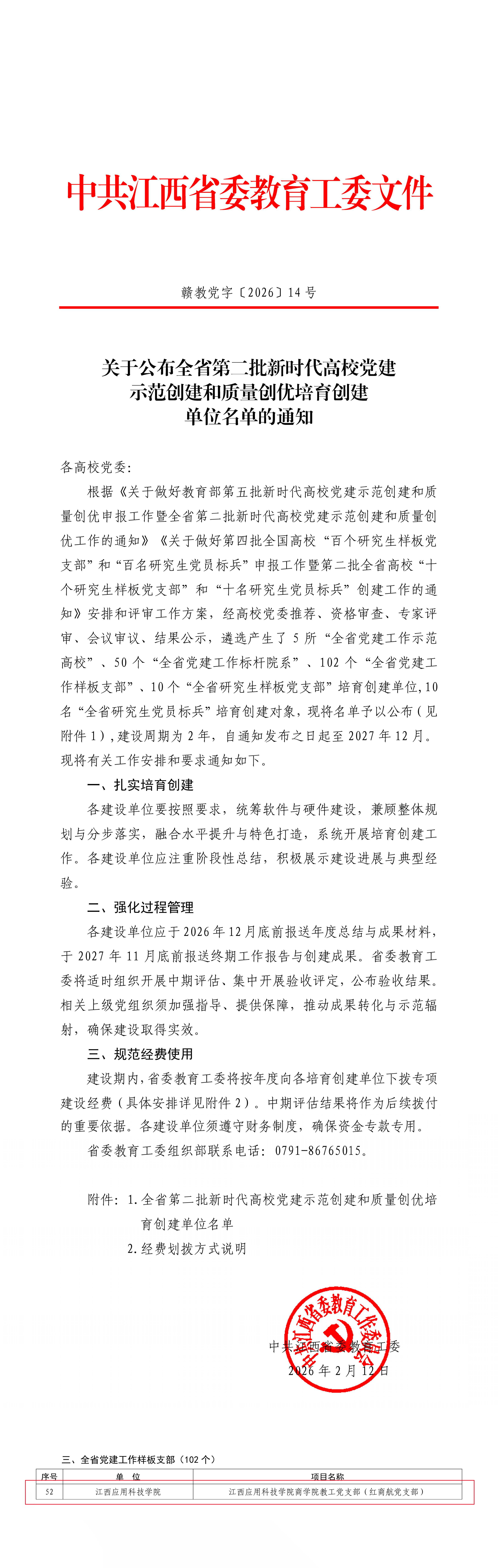 近日,江西省委教育工委发布《关于公布全省第二批新时代高校党建示范创建和质量创优培育创建单位名单的通知》,学校商学院教工党支部(红商航党支部)获批“全省党建工作样板支部”培育创建单位,这是学校基层党建工作取得的新的荣誉,也是学校基层党建工作的重要成果。