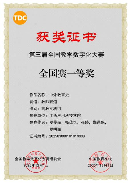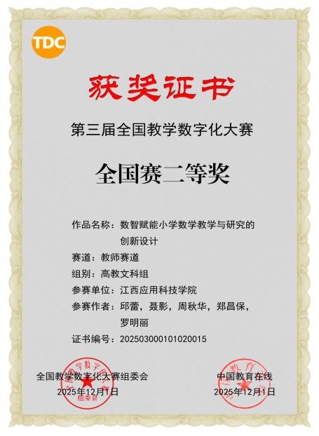 2025年11月29日,第三届全国教学数字化大赛圆满落幕。我院罗曼丽、邱蕾两位教师凭借出色的数字化教学设计与实践,分别荣获全国赛一等奖和二等奖,充分展现了我院教师在教育数字化转型中的积极探索与扎实成果。