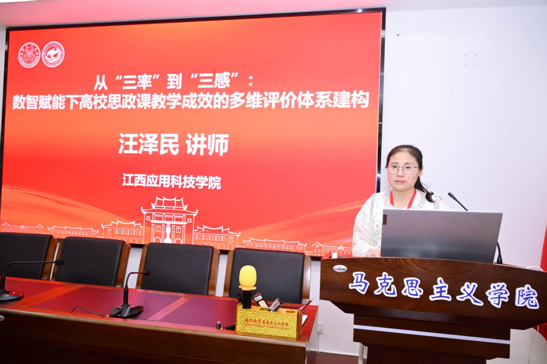论坛上,汪泽民副院长作了题为《从“三率”到“三感”:数智赋能下高校思政课教学成效的多维评价体系建构》的发言。她指出,长期以来,高校思政课教学评价过度依赖“到课率、抬头率、点头率”这“三率”指标,存在难以触及价值塑造核心等问题。为此,提出在数智技术赋能背景下,推动评价重心从“三率”向“获得感、认同感、使命感”跃迁,构建兼具价值高度、心理深度与技术可行性的多维评价体系。