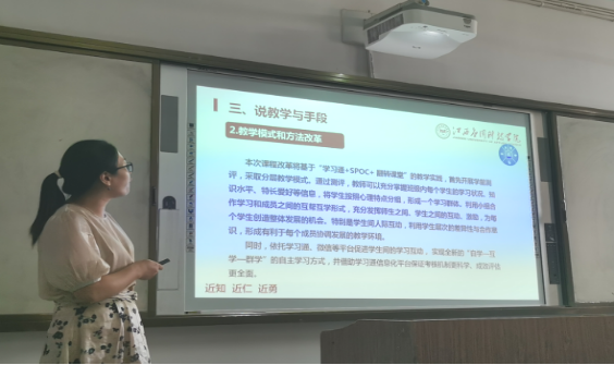 结合OBE理念和以学生为中心,学院第二批9位参加课改的教师针对课程教学目标、教学内容选择、课程思政融入、资源条件建设、教学方法改革、评价模式改革等方面进行课改课程说课。教师们精心准备、沉重应对,在说课中结合个人主讲课程,说出特色、说出亮点。教材和教法应用上,教师们充分考虑学生学情,整合教材,体现出不同的专业特点。教学手段上,教师们围绕高效课堂,紧扣教学目标,使用多种新型的教学方法,激发学生学习兴趣。教学改革上,教师利用多种教学模式,层层深入,解决问题。