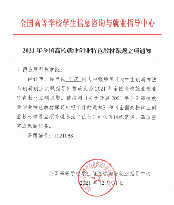 本网讯(记者/严远磊)近日,全国高等学校学生信息咨询与就业指导中心公布了2021年全国高校就业创业特色教材课题立项名单,全国共199个项目获得立项。江西应用科技学院王庆申报的《大学生创新方法与创新创业实践指导》(课题编号JC21068)在立项之列。