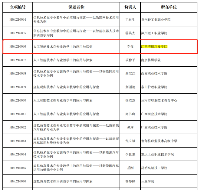 本网讯(记者团记者/陈美玲、尹志恒)近日,教育部行业职业教育教学指导委员会工作办公室下发《关于职业教育改革创新课题立项的通知》,公布了2021年度立项研究课题,江西应用科技学院教师李俊的《人工智能技术在专业教学中的应用与探索》成功立项,首次获批教育部课题资助20万元。