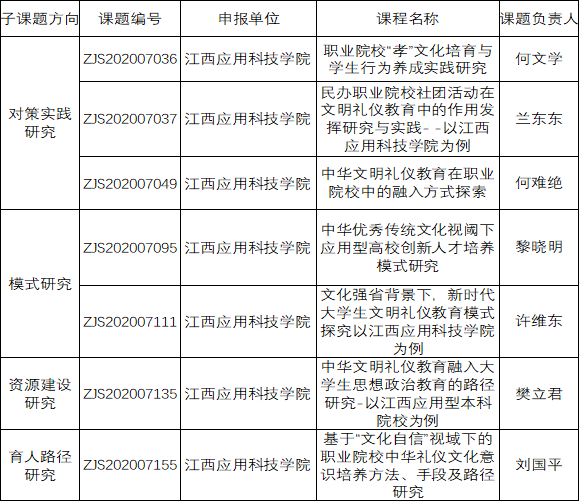 在此次学校研究子课题获准立项中,由何文学负责的《职业院校“孝”文化培育与学生行为养成实践研究》、兰东东负责的《民办职业院校社团活动在文明礼仪教育中的作用发挥研究与实践——以江西应用科技学院为例》、何难绝负责的《中华文明礼仪教育在职业院校中的融入方式探索》在对策实践研究子课题方向获立项。由黎晓明负责的《中华优秀传统文化视阈下应用型高效创新人才培养模式研究》、许维东负责的《文化强省背景下,新时代大学生文明礼仪教育模式探索以江西应用科技学院为例》在模式研究子课题方向立项。由樊立君负责的《中华文明礼仪教育融入大学生思想政治教育的路径研究—以江西应用科技学院为例》获资源建设研究子课题方向立项。由刘国平负责的《基于“文化自信”视域下的职业院校中华礼仪文化意识培养方向、手段及路径研究》获育人路径研究子课题方向立项。