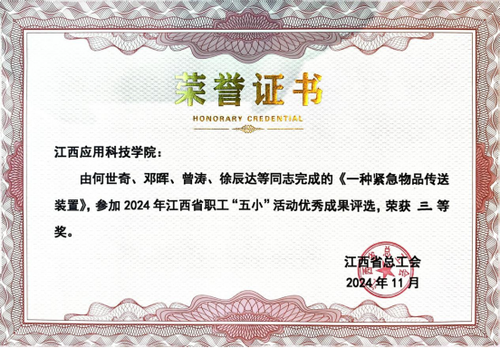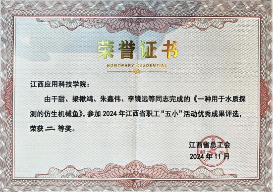 近日,2024年江西省职工“五小”活动优秀成果发布会在赣州市举行。经过成果演示、经验分享、成果点评等环节,我校推选的两个项目均获奖。学校常务副校长干甜团队的《一种用于水质探测的仿生机械鱼》荣获二等奖,智造学院何世奇老师团队的《一种紧急物品传送装置》荣获三等奖。