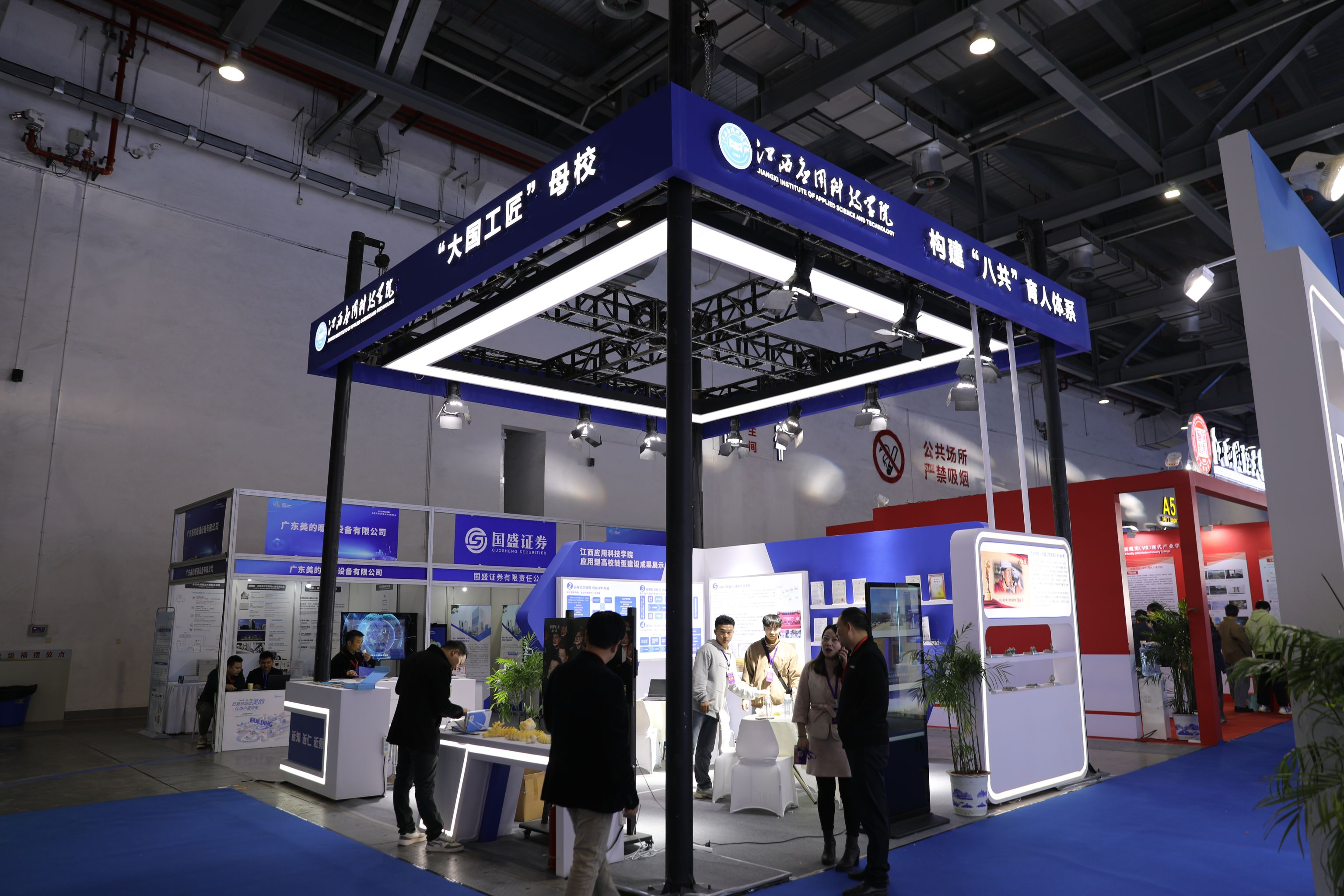 江西应用科技学院展区位于博览会的核心区域,展示面积宽敞,布局合理,充分展示了学院在数字经济与新基建领域的最新研究成果和应用案例。