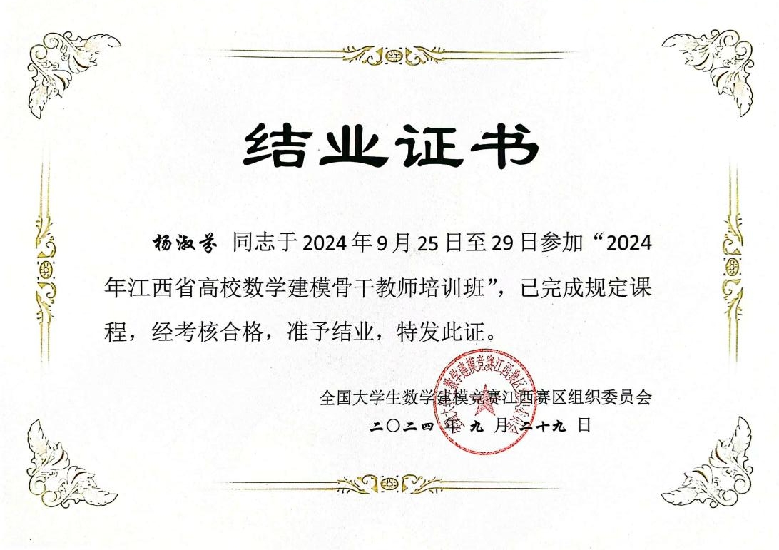 为了更好地推动我校数学建模教学与竞赛活动的开展,促进我校指导教师教学和科研能力的提高,加强与其他高校数学建模骨干教师的交流,公共教学部派数学教研室主任、数学建模负责人杨淑芬老师参加了9月25日至9月29日由全国大学生数学建模竞赛江西赛区组委会主办的“2024年江西省高校数学建模骨干教师培训会”,江西省大学生数学建模竞赛执委会委员及各高校大学生数学建模竞赛负责人参加了此次会议。