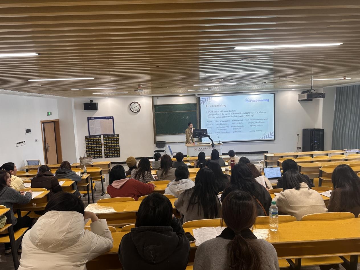 活动中,董黛老师呈现了一堂精彩的公开课《The Humanities: Out of Date?》。课程以“人文是否过时”为切入点,采用创新的“PWP”教学模式,引导学生思考人文科学在AI时代的独特价值:课前准备阶段,学生通过在线学习了解人文与应用科学的区别;课堂环节通过文本分析培养学生的批判性思维;课后讨论则聚焦AI时代人文教育的发展前景,充分展现了英语教学与思政教育的有机融合。