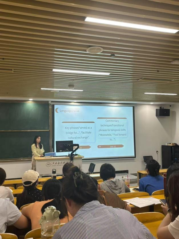 会议伊始,钟帆老师以“How can college English class serve as the bridge of culture to tell ‘Stories of China’well”为题进行教学分享,通过分析“丝绸之路文化展”PBL项目案例,钟老师展示了如何引导学生用英文撰写解说词、制作双语视频,将语言训练转化为文化传播实践,激发学生主动性和创造力。