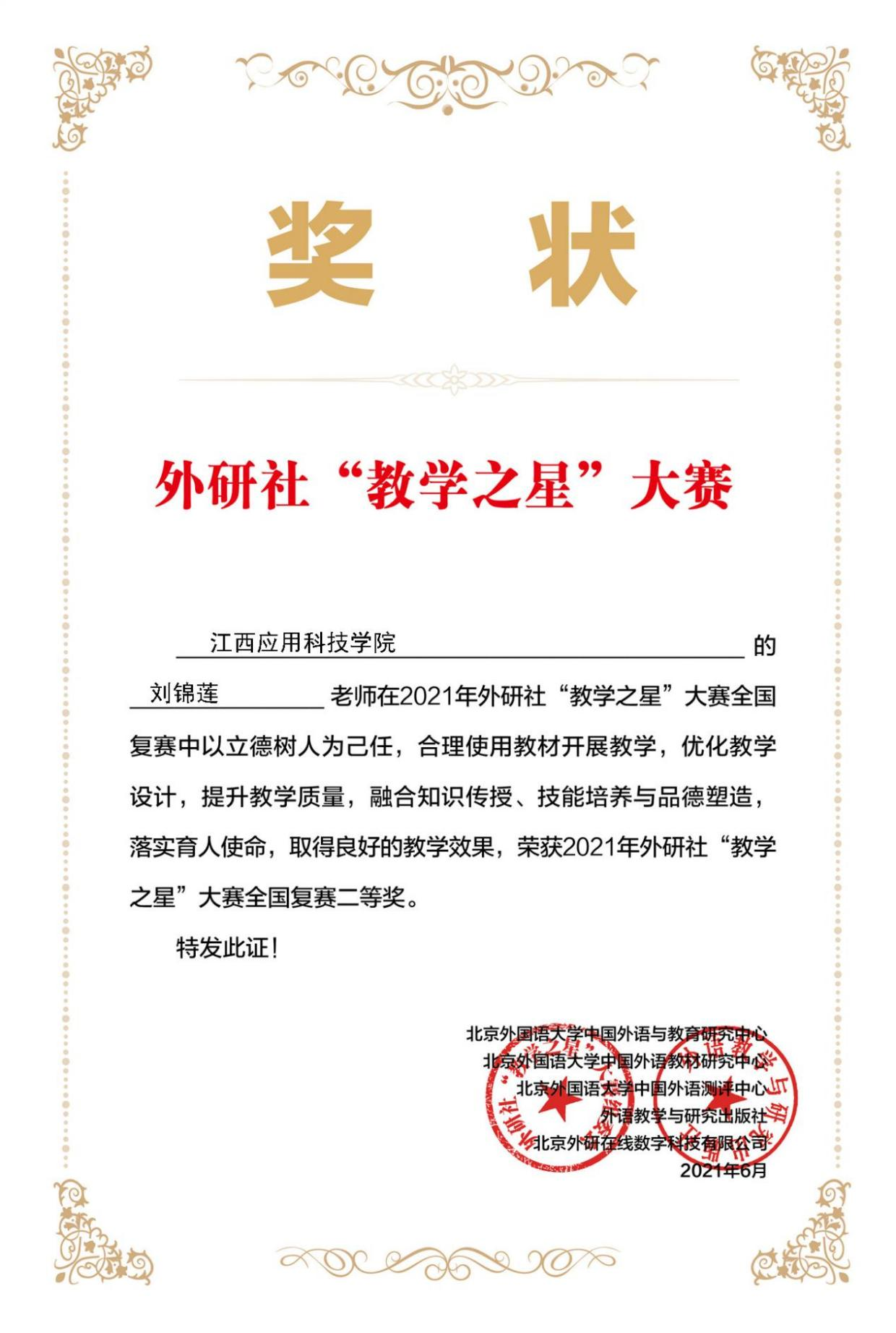 刘锦莲老师获得2021年外研社“教学之星”大赛全国复赛二等奖