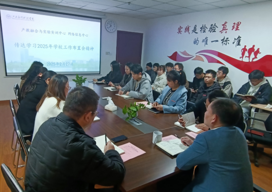 2月27日上午,产教融合与实验实训中心在综合大楼1106会议室召开专题学习会,传达学习学校2025年工作布置会精神。中心主任刘宇中参加会议并讲话,会议由副主任徐燕兰主持,中心全体成员参加。