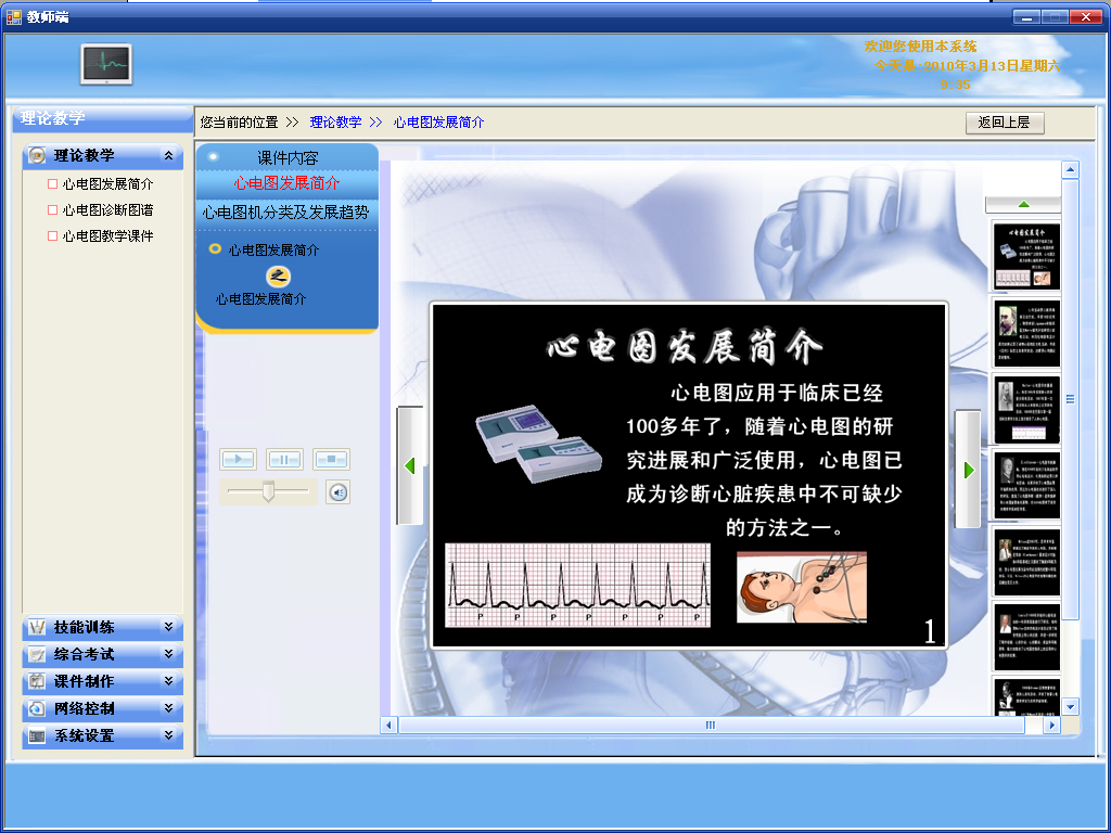 心电图是临床上最常用的检查方法,是《诊断学》教学中的重点和难点:说它是重点,因为它是临床医生所必须掌握的基本功;说它是难点,因为心电图不容易学习,比较抽象,不好理解。网络多媒体心电图模拟教学系统既具有一般多媒体教学直观、形象、生动等优点,又与网络相结合克服了多媒体教学老师不能当面指导的缺点,学生还可以利用系统自带的“模拟12导电脑同步心电图机”在模拟人身上根据标志位正确连接,利用电脑正确描记、分析、打印各种心电图,模拟人还支持单独与其他各种心电图机连接操作。本系统包括理论教学、技能训练、综合考试、课件制作、网络控制、系统设置六大模块,基于B/S(网页)模式、支持TCP/IP协议(网线结构)的网络架构,易于更新、管理,方便接入校园网,实现良好的教学互动。软件上包括“系统设置”、“内容制作”、“教师授课”等,可以设定管理员、教师、学生、三种身份,通过“内容制作系统”方便在服务器端更新全部内容,教师可自编试题,自动评分汇总全班成绩。教师可以通过网络指导、控制、监控学生机的操作,并对学生机问题进行答疑,可以与学生进行文字对话交流。理论教学包括心电图发展简介、心电图诊断图谱、心电图教学课件三部分。技能考核是指通过系统自带的“模拟12导电脑同步心电图机”与模拟人正确连接,可以真实描记、分析各种正常、异常心电图,与临床操作完全一致。模拟人储存有100种正常及各类异常心电图,心电图采集软件配有测量尺,可以任意测量心电图各波段振幅及时间等,模拟人还支持与其他任何临床心电图机单独连接操作;可以连接外接打印机,打印12导心电图波形。