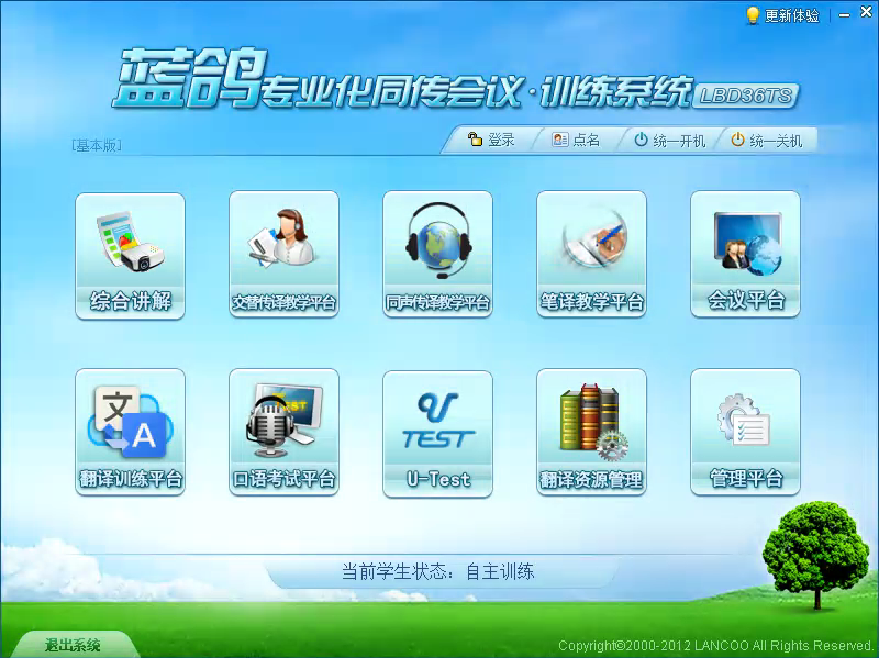 LBD3600T系统软件由以下几大模块组成:综合教学平台、会议平台、同声传译教学平台、交替传译教学平台、笔译教学平台、翻译训练平台、口语考试平台、管理平台、资源平台。该实训室能进行商务英语口译、商务英语翻译、商务英语口语和口语考试等课程的教学。