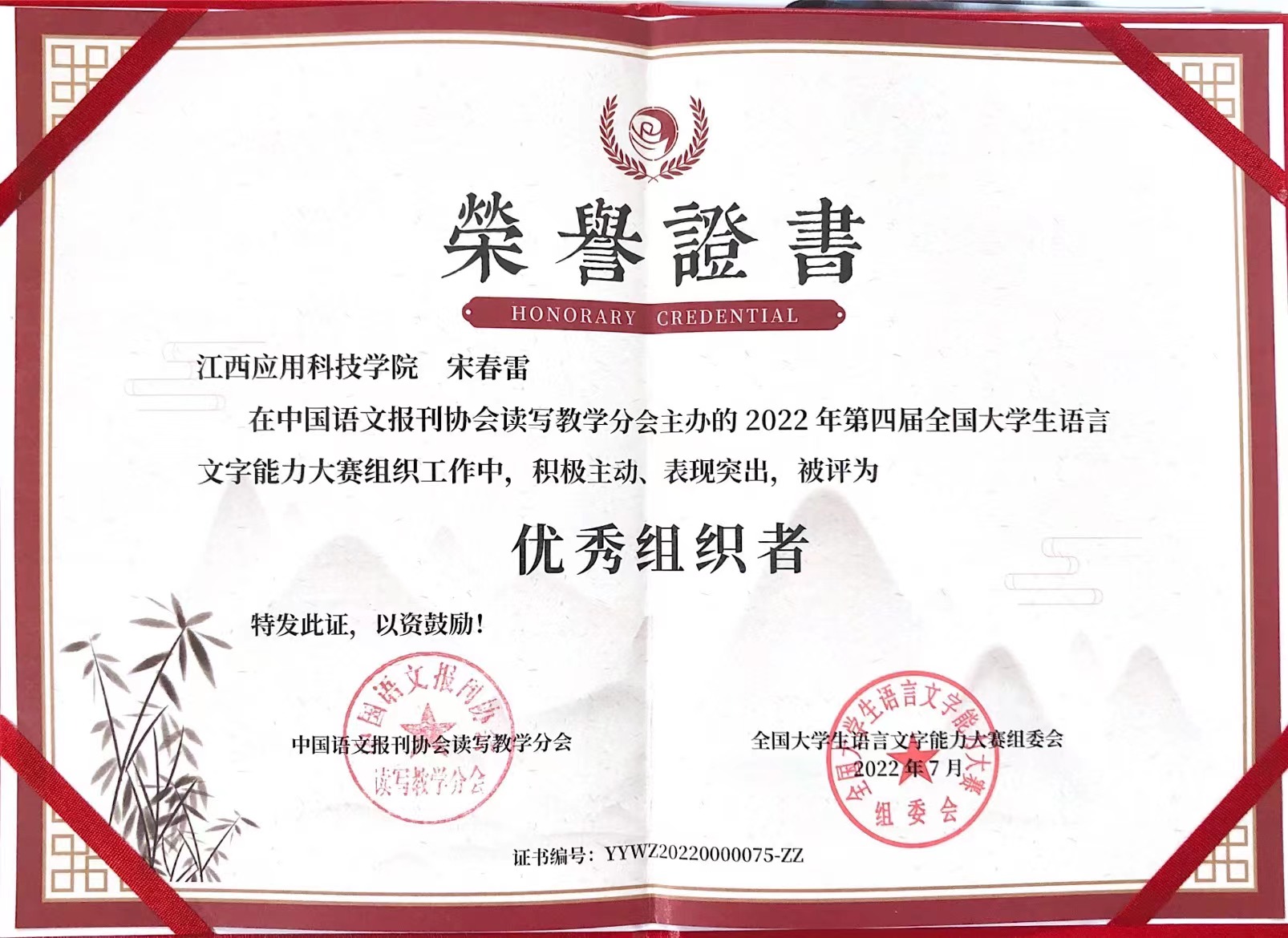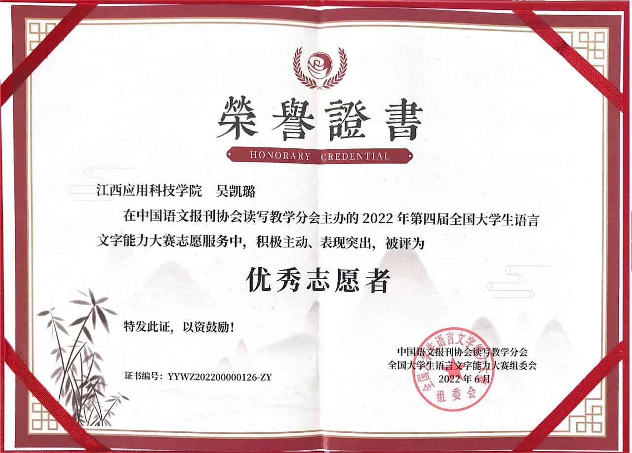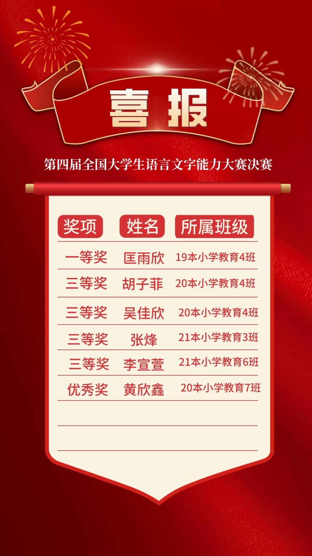 日前,由中国语文报刊协会读写教学分会主办的“第四届全国大学生语言文字能力大赛”圆满落幕。决赛共有来自清华大学、北京理工大学、南京师范大学、安徽大学、华东师范大学、苏州科技大学、江西应用科技学院等在内的691所高校的学生入围参加。经语文专业老师多轮阅卷评审、并加权初赛成绩后,教育学院在罗明丽、唐娅男等五位老师的指导下,共有匡雨欣等6位同学在全国决赛中斩获佳绩,其中1等奖1名,三等奖4名,优秀奖1名。教育学院党总支书记宋春雷荣获优秀组织者,吴凯璐同学荣获优秀志愿者。