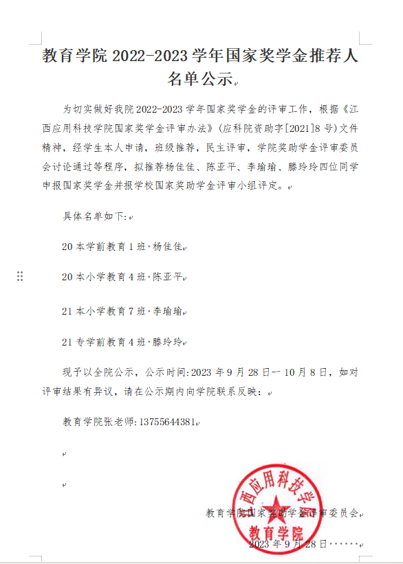 教育学院2022-2023学年国家奖学金推荐人名单公示