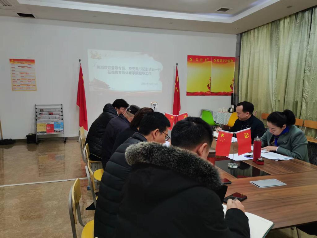 2020年12月10日督导专员、校党委书记彭迪云,副校长唐丽莉莅临教育与体育学院调研指导,学院院长汪强、党总支书记张荆、副院长王文平以及党总支委员参加了本次调研会议。