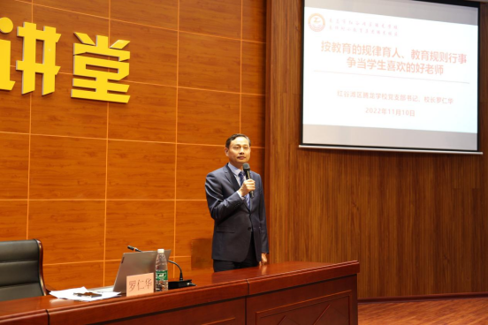在授课最后,罗仁华校长通过分析课堂“唠叨症”“软骨症”“急躁症”“贪食症”“失语症”“孤独症”“亢奋症”“瘦小症”等症结,就如何做有素养的教师、受欢迎的老师向师生进行了分享。一是有自己独特教学个性的老师,不人云亦云,有自己独特的教学思路和主张;二是对学生一视同仁的老师,要能够关注每一个学生,并爱护每个学生,是这一类老师所具备的能力;三是严而有度的老师,这种老师把班级管理得井井有条,有一整套管理理念和管理手段,并善于进行总结和反思;四是善于把握机会的老师,教育教学的过程中,每个细节都充满了教育的契机,但教育机会稍纵即逝。善于把握教育机会的老师,能够走进学生的心灵,了解学生心里在想什么,对学生能够换位思考;五是做事有分寸,能控制自己情绪的老师。职业化的教师,一定是能够控制自己情绪的老师,不将自己的不良情绪发到学生身上,也不把不良情绪带回家;六是风趣幽默的老师,每个学生都喜欢生动活泼而有趣的课堂;七是有宽容心的老师,这种老师心胸开阔,善解人意,对学生能够宽容的缺点错误采取宽容的态度,给学生很好的印象;八是以身作则的老师,身教甚于言说,凡是要求学生做到的,自己首先做到;凡是学生一下子难以做到的,从不强求学生。教学生做人,自己首先做好人;九是真才实学的老师;十是注意自身形象的老师,注意自身形象的教师,更具有亲和力和感染力,更容易融入学生群体,受到学生的喜欢。
