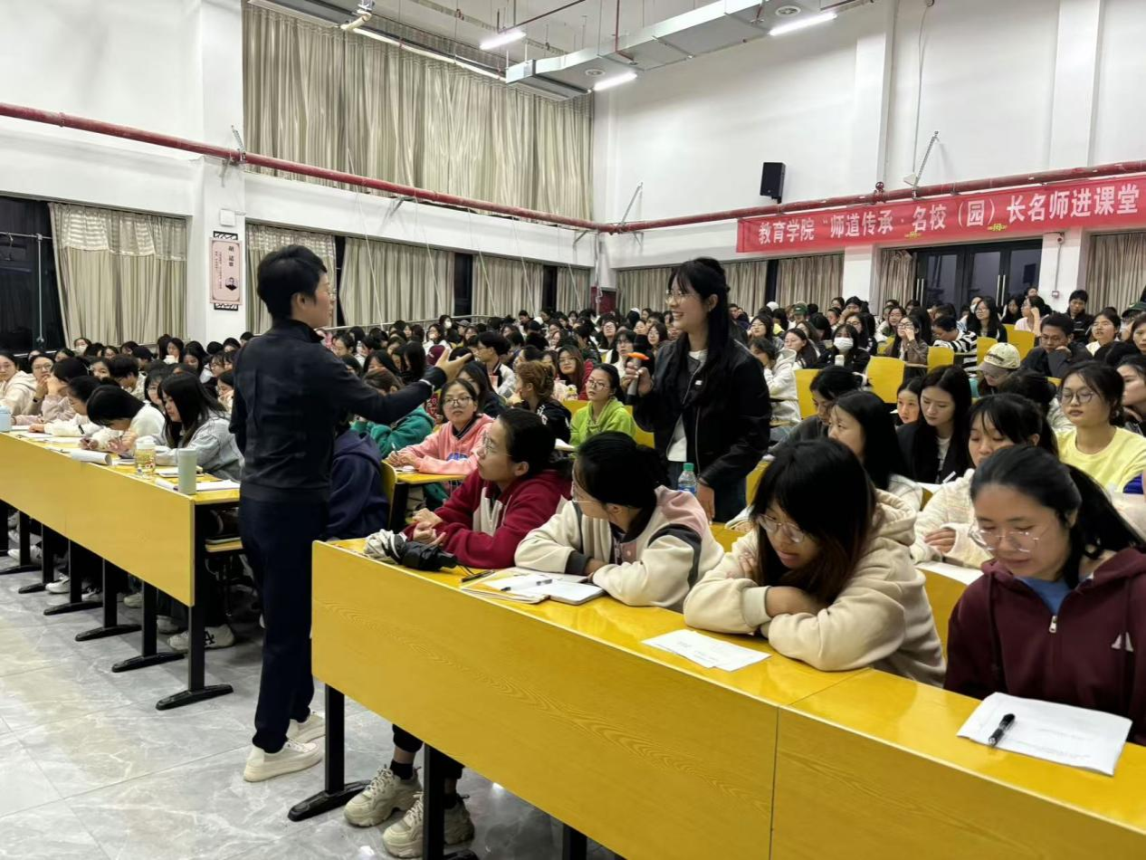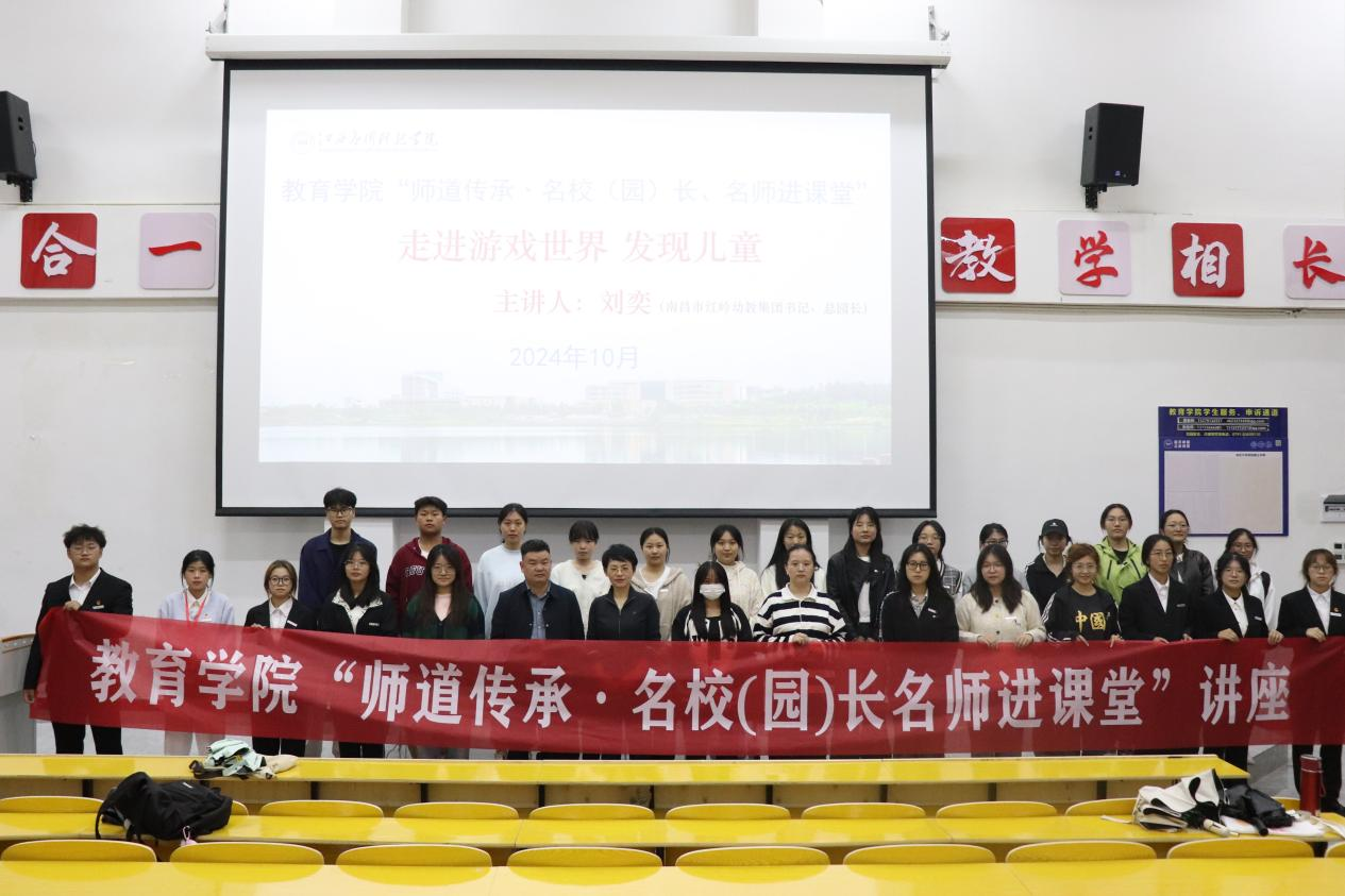 为进一步提升学院与区域基础教育的交流与沟通,加强师范生专业技能及职业素养,发挥区域基础教育领域名校(园)长、名师及其团队的教学引领与指导作用,强化学院师生对区域基础教育师资需求和课堂教学改革的清醒认识,加深学生对区域基础教育教师专业知识、专业技能和教育情怀的认识和理解,提升学生的责任意识和专业使命感,学院特举办第十八期“师道传承•名校(园)长名师进课堂”活动。10月27日,学院邀请到南昌市红谷滩红岭幼教集团书记、总园长,江西省学科带头人,省教育督导评估专家、省第一批学前教育质量提升计划指导专家、市学科带头人、洪城学师、市优秀校园长刘奕园长在志远楼101报告厅为2022级、2023级学前教育专业学生作了题为《走进游戏世界 发现儿童》专题讲座。