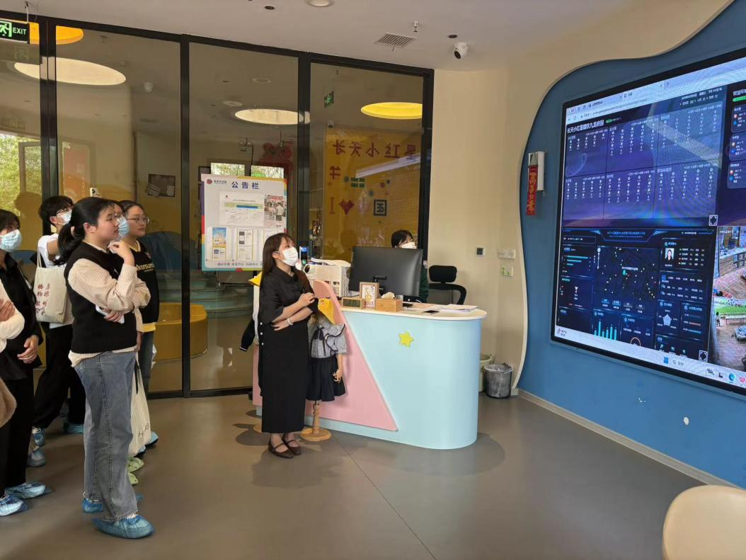 在托育中心实践环节中,学生们在园长的引导下,深入了解托育中心环境创设的专业逻辑。从婴儿活动区、户外活动区到保健室等功能区域,园方系统介绍了如何根据婴幼儿成长规律进行空间规划和材料投放,生动诠释了“环境即教育”的理念。教师带领学生围绕环境设计背后的婴幼儿发展支持策略开展观察记录与反思分析,强化课程理论在真实情境中的转化应用。