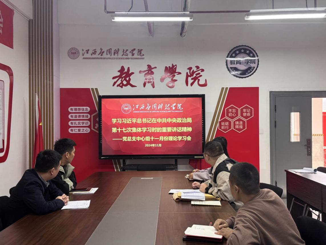 2024年11月5日,教育学院党总支十一月份中心组理论学习(扩大)会在志远楼102党员会议室召开。教育学院党总支副书记贾鹏军以学习习近平总书记在中共中央政治局第十七次集体学习时的重要讲话精神为主题开展理论学习领学。各党总支委员和全体党务干部参加此次会议,智能制造学院党总支专职组织员吴勤列席旁听。