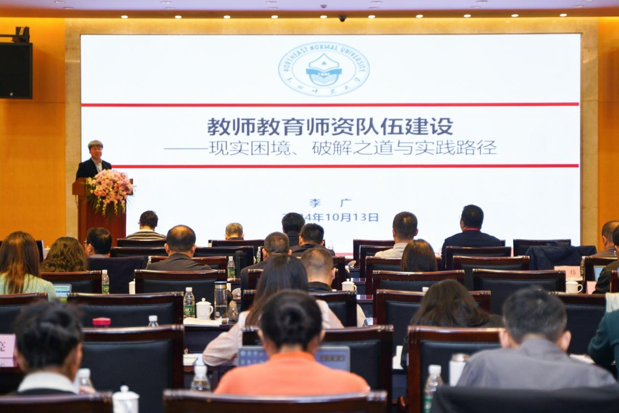 在13日上午第二场主旨报告中,东北师范大学教师教育研究院执行院长李广教授做题为《教师教育师资队伍建设:现实困境、破解之道与实践路径》主旨报告,报告以人口高质量发展支撑中国式现代化为导引,讲述了人口高质量发展现实样态,通过对教师教育现实困境的分析,提出破解之道,包括强化属性,凸显本色、建设平台,凸显特色、运用资源,彰显底色;广州大学教育学院院长马凤岐教授做题为《中国教育学自主知识体系的唯物主义思想方法》主旨报告。报告从马克思主义唯物主义认识论与历史唯物主义、中国教育学自主知识体系的唯物主义认识论和中国教育学自主知识体系的唯物主义人性论三个方面阐述;清华大学教育研究院副院长张羽教授做题为《人工智能对教育研究与范式转型的可能贡献》主旨报告。报告论述了教育研究无法系统指导实践改进以及教育研究范式本土化困难等危机,并提出了人工智能对教育研究范式转型的可能贡献;浙江大学教育学院副院长李艳教授做题为《智能时代高校教育教学变革及应对》主旨报告。报告讲述了高等教育教育技术的重要进展如何分析了智能时代高校教育教学变革趋势。分析了生成式人工智能带给高校的机遇与挑战,并从不同角度提出了对于人工智能的应对策略;湖南师范大学教育科学学院副院长容中逵教授做题为《乡村教师的稳定供给:基础教育强国建设的重中之重--以师范生毕业分配为主渠道的政策考量》报告论述了基础教育强国建设在乡村教师的理由,并阐明了乡村教师难以稳定供给的施疗与措施,给出的措施包括师范生培养,职业轮岗制度等措施;北京师范大学教育学部副部长宋萑教授做题为《高质量教师教育体系构建与教师教育学科建设》报告首先论述了教师供需的质量关系、数量关系、结构关系问题以及介绍了所做的教师需求预测并针对相关问题提出六个路径。