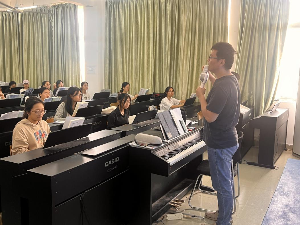 在示范课上,赵明老师以生动的语言详细讲解了声乐基础理论知识,从气息控制到发声技巧,逐一剖析,使得复杂的声乐知识变得易于理解。他巧妙地将抽象的声乐理论知识转化为具体可视化的动作训练,通过生动的肢体语言和形象化的演示,帮助学生直观理解并掌握这些技巧,极大地提高了学习的效率和效果。随后,学生们在赵明老师的带领下,跟唱起了经典曲目《送别》。赵老师不仅亲自示范,还逐一指导学生们调整发声状态,确保每个人都能找到最适合自己的歌唱方式。在跟唱过程中,学生们不仅提高了歌唱技巧,更深刻地理解了歌曲所传达的情感与意境,体会到了声乐艺术带来的心灵震撼。