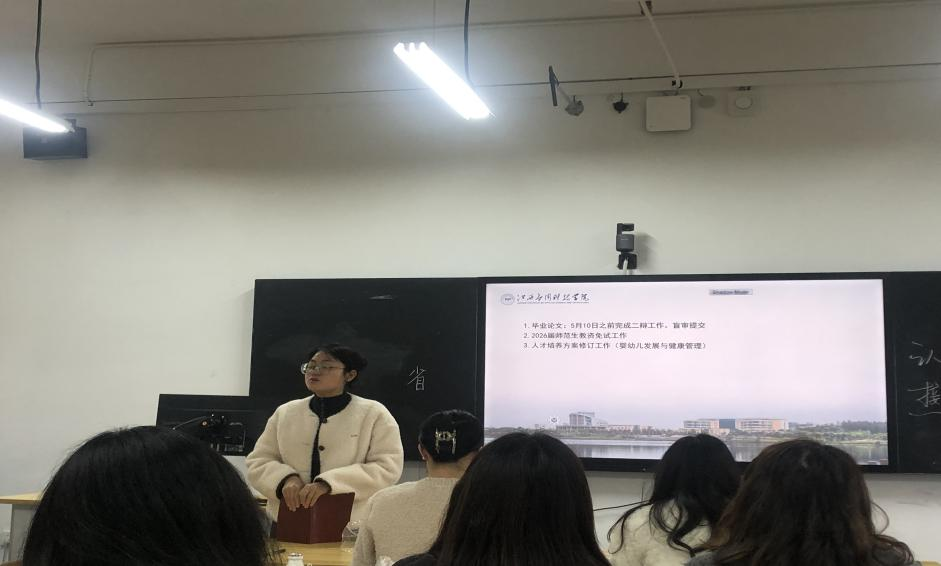 接下来,教研室主任陈会会对近期教研室的几项重点工作进行了系统梳理与明确分工。一是抓实2026 届毕业论文质量管理,强调严把过程关、评审关,强化指导教师责任,全面提升毕业论文质量与学术规范性。二是推进 2026 届师范生教资免试相关工作,明确任务分工与时间节点,要求细致做好材料审核、流程对接、政策解读与学生服务,确保免试工作平稳高效完成。三是启动新增职业本科专业《婴幼儿发展与健康管理》人才培养方案修订工作,围绕专业定位、课程体系、实践教学、师资配置等核心要素,明确修订思路、责任分工与完成时限,推动新专业高标准建设、高质量起步。