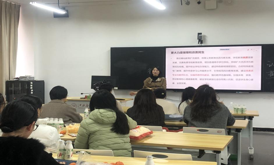 首先,贾林静老师带领全体教师学习国务院总理李强所作的政府工作报告,报告涵盖一项关于以更大力度保障和改善民生的内容。贾老师结合学前教育专业特点与社会民生需求,解读教育民生、托育服务、儿童发展保障等政策导向,引导教师将立德树人、服务民生融入日常教学与人才培养,强化专业使命感与社会责任感。