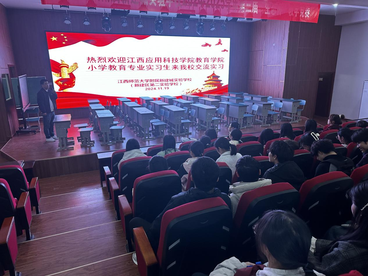 2024年11月19日,江西师大附属新建城实验学校与学院2021级实习生见面会暨实践教学基地授牌仪式在师大附属新建城实验学校顺利举行,学院副院长刘晓领、教务科长袁野、实习指导老师胡誉,师大附属新建城实验学校副校长张同柏、教务处主任龚文俊以及学院2021级小学教育专业41位实习生参加了会议。
