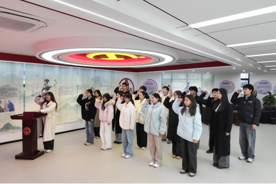 “原来宪法的温度就在我们身边!”参观过程中,同学们不时发出感慨。随后,学校党委宣传部大学生宣讲团成员围绕公民权利义务,结合校园生活与社会热点,开展了一场“案例说法、故事明理”的专题宣讲。宣讲结束后,现场举行了庄严的宪法宣誓仪式。师生们面向国旗、右手举拳,誓言铿锵,表达了尊崇宪法、恪守法治的坚定决心。