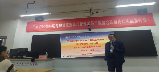 为适应区域经济社会发展对人才培养的更高要求,大力加强学生实践能力和综合素质的培养,着力提高应用型人才培养质量,江西应用科技学院产教融合发展论坛现代管理学院分论坛于2023年11月25日下午14:00在劲松楼204举行了“酒店行业从业及未来发展”为主题的专题报告会,报告会由南昌绿地铂瑞酒店人力资源总监汪俊主讲,由酒店管理教研室主任刘影主持,现代管理学院院长樊立君、酒店管理专业全体师生参加了讲座。