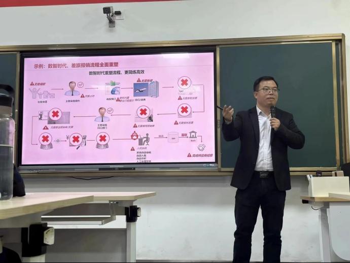 本次论坛分为主会场和分会场,其中,财经学院分论坛于11月25日下午14:00-15:30在行知楼124、125、128教室召开。在124教室,主讲人陈琨鹏开展了“智能财务,洞见未来”专题讲座,讲述了他对数智化时代财务管理的见解。
