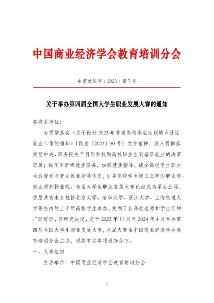 为贯彻落实《关于做好2023年普通高校毕业生到城乡社区就业工作的通知》(民发〔2023〕30号)文件精神,深入贯彻落实党中央、国务院关于引导和鼓励高校毕业生到基层就业的决策部署;强化不断线就业服务,加强就业指导,健全高校学生职业生涯规划与就业创业指导体系,引导高校学生树立正确的职业观、就业观和择业观。全全国大学生职业发展大赛已经成功举办三届,往届共有来自包括北京大学、清华大学、浙江大学、上海交通大学等在内的上千所高校学生参加,受到了各高校老师和学生们的广泛好评,经研究决定,定于2023年11月至2024年4月举办第四届全国大学生职业发展大赛,本届大赛由中国商业经济学会教育培训分会主办,详细规程如下。