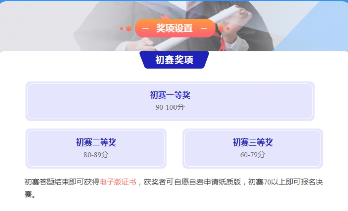 初赛形式:初赛为40道选择题,主要就职场应对相关知识点进行考察,答题时间为30分钟,满分100分,答题结束且及格(大于等于60分)后即可获得初赛电子版证书。