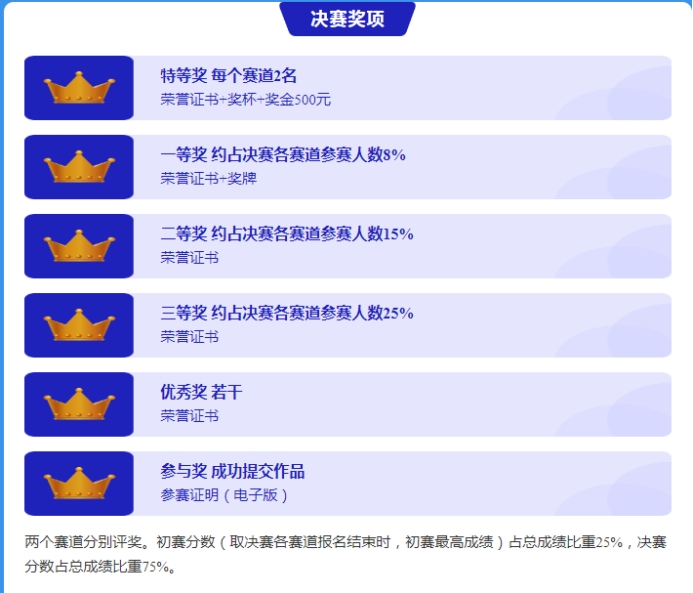 (二)决赛环节,初赛组织参赛200人以上的协办单位在两个赛道各有5个指定决赛参赛名额(需初赛70分以上),由协办单位统一收稿提交,无参赛费用。也欢迎其余入围决赛的参赛者自行报名参加决赛,为应对决赛环节不断攀升的组织、技术、评审及证书工本邮寄等成本,自行报名决赛的参赛者酌情收取50元(此用于包括但不限于大赛组织安排、技术开发、聘请专家命题、人工评审评阅、证书制作、快递邮寄、奖金等费用),恳请参赛者谅解为盼。