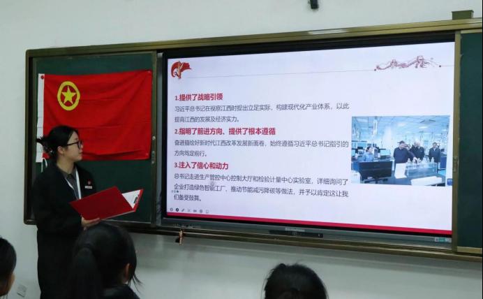 本次宣讲围绕习近平总书记考察江西重要讲话精神展开。宣讲人蔡雯带领同学们重温了习近平总书记考察江西重要讲话精神,学习了习近平总书记考察江西重要讲话精神为江西改革做出的贡献,指出如何在江西建设中贯彻落实习近平总书记考察江西重要讲话精神,并号召同学们牢记习近平总书记的殷殷嘱托。深入了解习近平新时代中国特色社会主义思想“江西篇”: