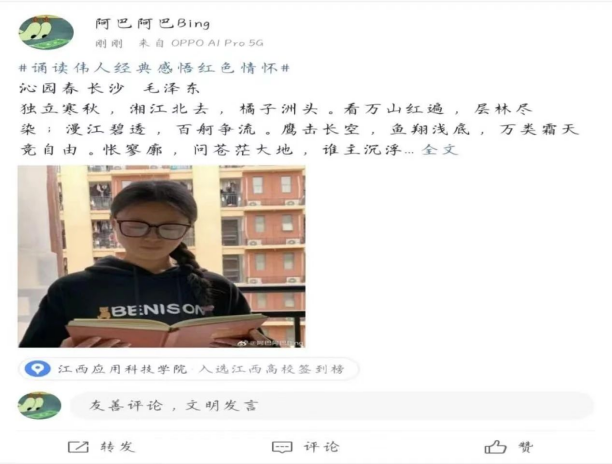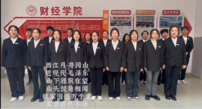 为助推同学们领悟毛泽东同志诗词中的豪情壮志,以此致敬先辈、增强爱国情怀、坚定理想信念,激励同学们赓续老一辈革命家的精神血脉,不负青春、不辱使命,财经学院特开展毛泽东同志诗词诵读活动,并拍摄视频,积极动员各班同学参与诗词诵读拍摄活动。(文/吴宜安)