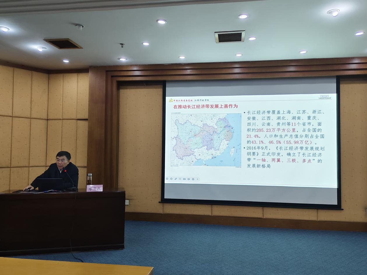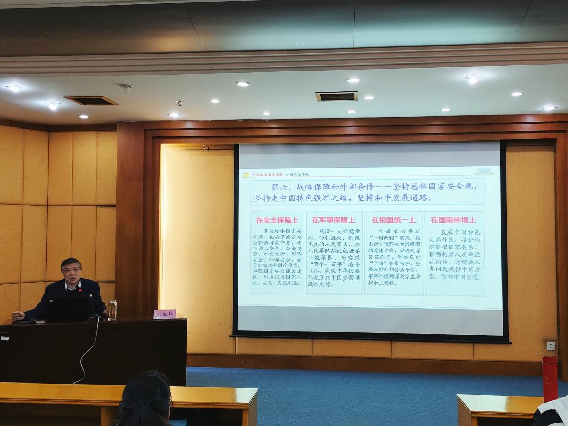 江泰然教授谈到国内国际面临着不少困难和挑战时,提出要不断把学习贯彻习近平新时代中国特色社会主义思想引向深入。深刻领会习近平总书记在四地考察时所指出的“以学铸魂”、“以学增智”、“以学正风”及“以学促干”系列重要讲话精神,一是把理论学习成果转化为坚定的力量信念,二是把理论学习成果转化为对党忠诚,三是把理论学习成果转化为以人民为中心的发展思想。
