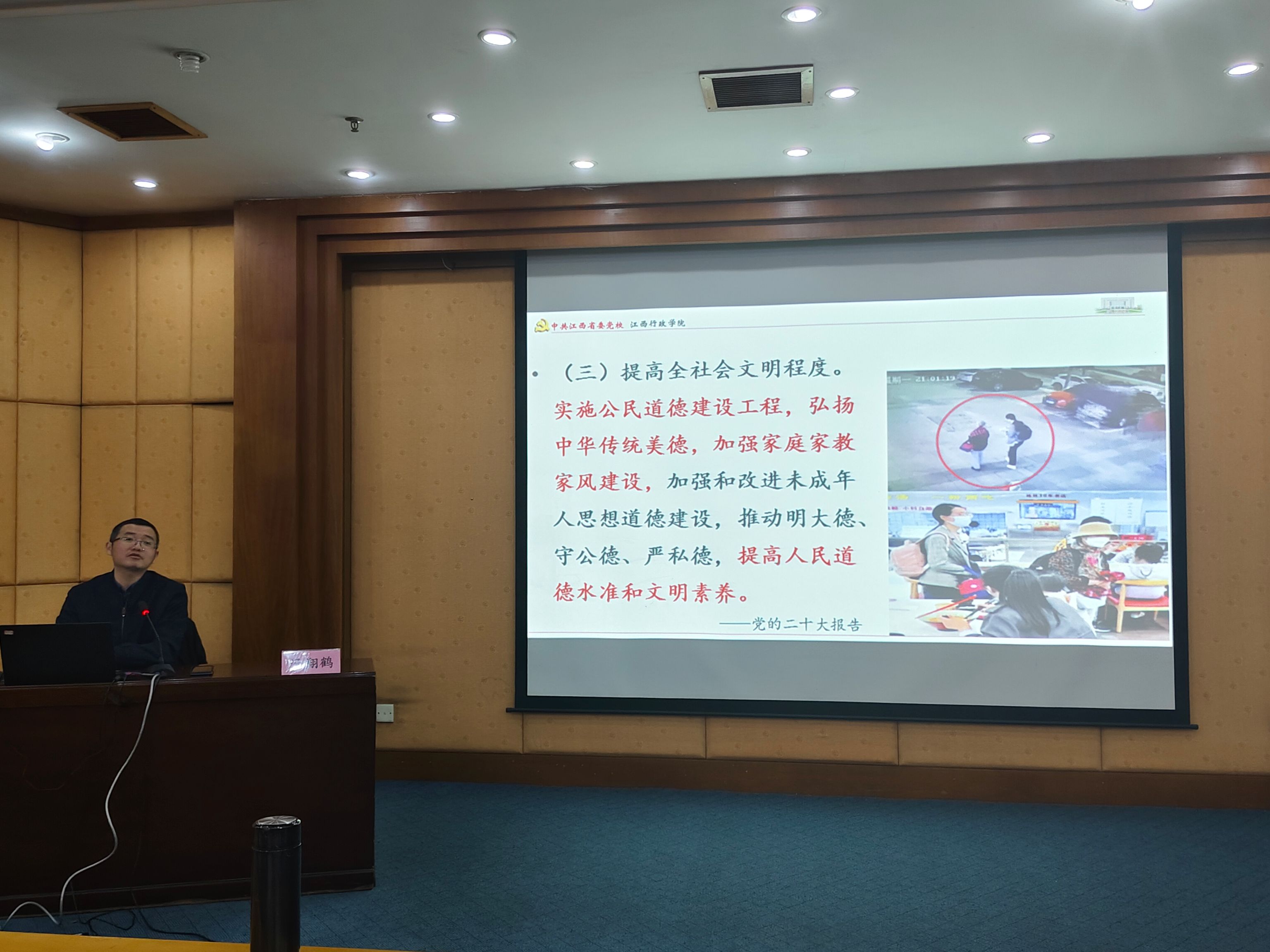 本次教学以推进文化自信自强为主题,从全国宣传思想文化工作会议以及党的二十大报告出发,汤翔鹤教授主要从文化自信自强是精神力量之源、铸就社会主义文化新辉煌、谱写江西文化强省建设新篇章三方面内容进行展开讲述。他指出,提到要充分发挥红色资源优势,建设全国红色基因传承示范区、以创意开发为引领,加快产业融合发展、科学保护合理与开发,让历史文化资源活起来,同时也贯穿了丰富的案例,充分认识到江西省资源的充分利用的重要性。