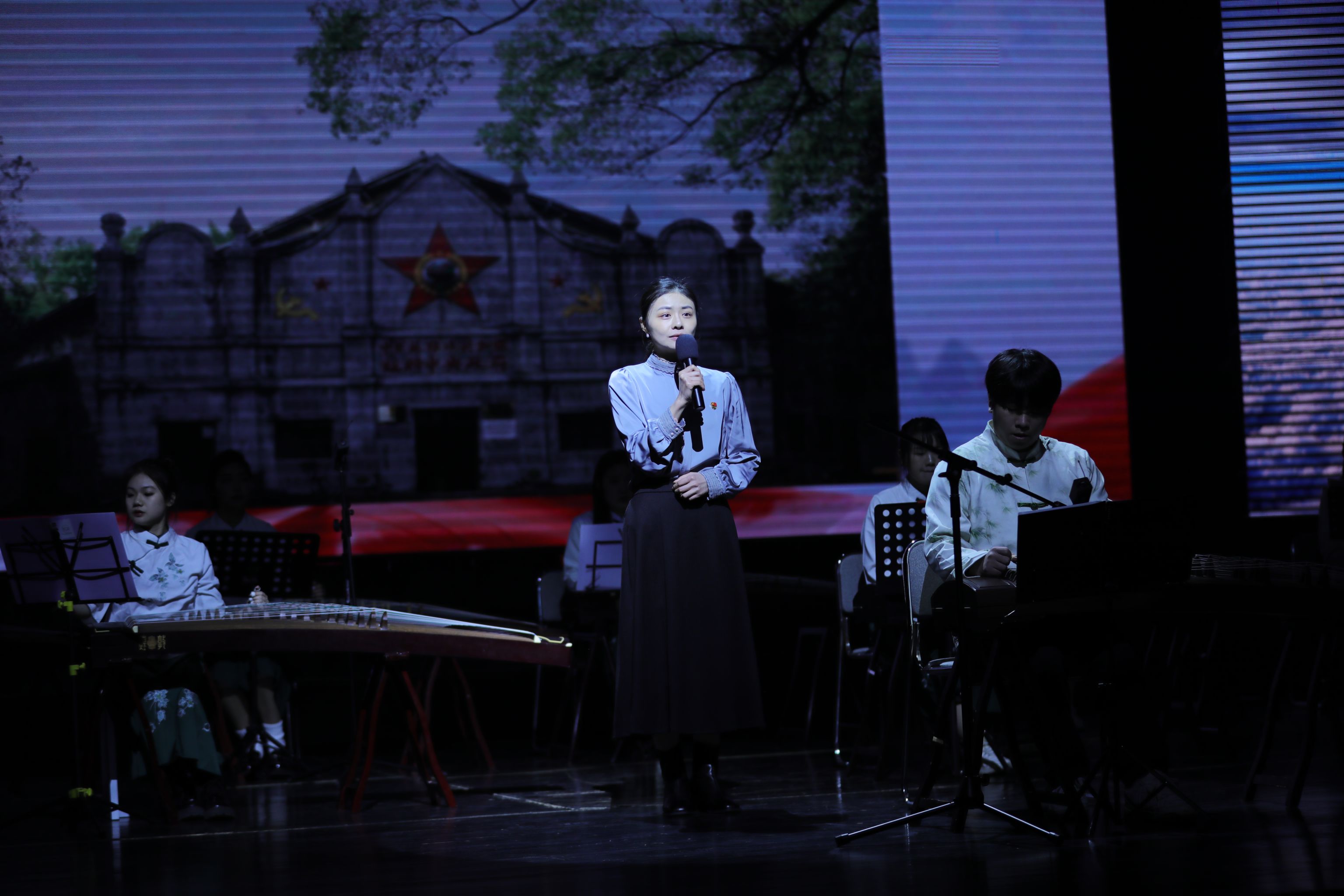 此次教学汇报以中国共产党党史为主线,围绕四个历史时期进行设计教学内容。首先由思政课教师讲述时代背景,再由专业课教师选取此时期的作品,以课堂教学的形式展示。本次教学活动分别以:初心如故需笃行、革命理想高于天、携手人民辟江山、敢闯新路育新篇、奋发图强谋复兴、梦想启航谱华章等六个专题展现。