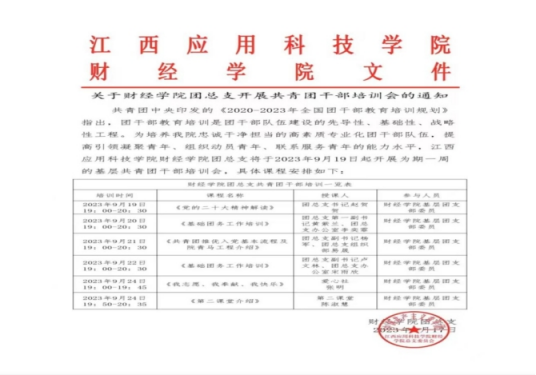 为学习贯彻党的二十大精神,进一步加强基层团组织建设,提高团干部的工作积极性以及责任担当意识,江西应用科技学院财经学院团总支于2023年9月19日起开展为期一周的基层共青团干部培训会。