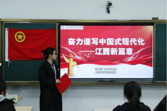 为深入学习贯彻习近平总书记考察江西重要讲话精神,进一步推进财经学院思想政治工作,掀起一阵持续学习、宣传、贯彻习近平总书记考察江西重要讲话精神的热潮。财经学院与光同尘青年宣讲团于2023年11月28日晚上开展了“奋力谱写中国式现代化——江西新篇章”专题进班宣讲活动。深入学习领悟,提高政治站位,围绕“走在前、勇争先、善作为”目标要求,积极履职尽责,主动担当作为,为奋力谱写中国式现代化江西篇章贡献智慧和力量。