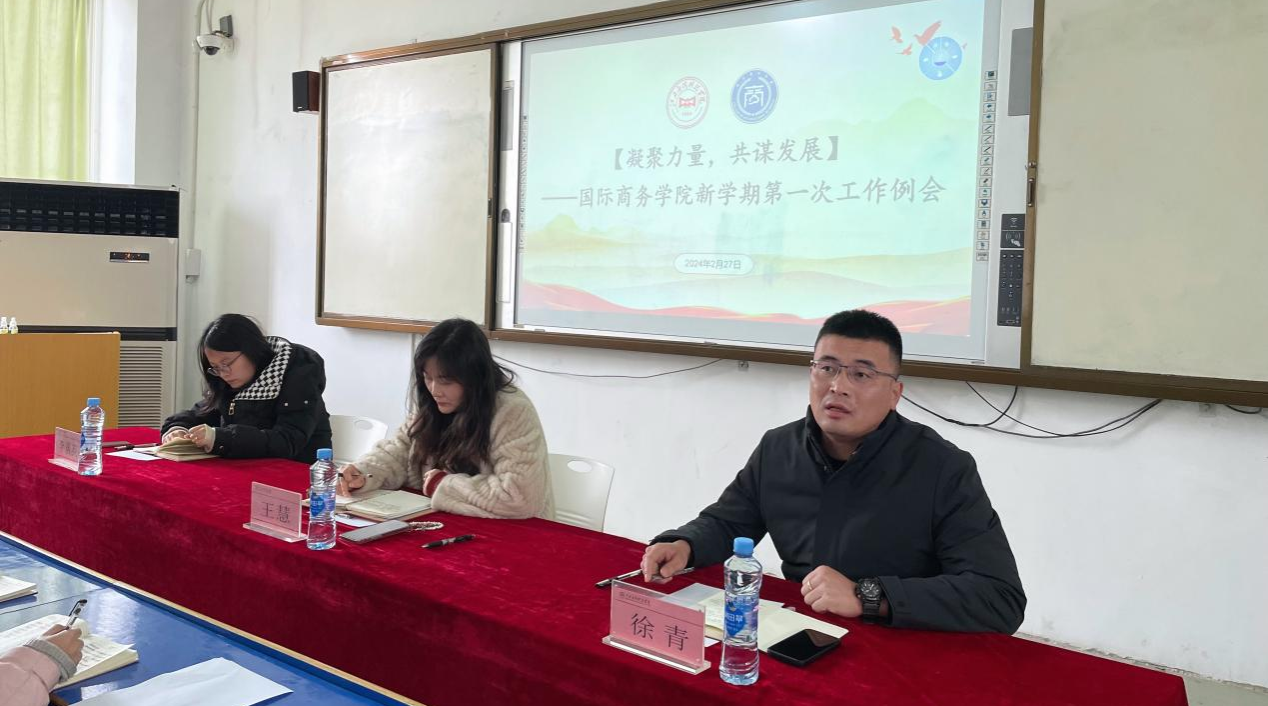 2024年2月27日下午,国际商务学院全体教师例会暨2023~2024学年第二学期第一次开学筹备会议在三达楼204教室召开,国际商务学院院长王慧、国际商务学院党总支书记徐青、国际商务学院副院长李居英及全体行政干部、教职工参会。