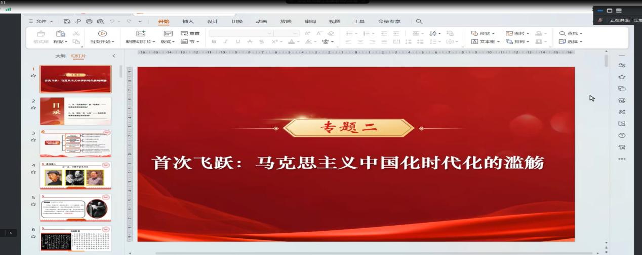 备课伊始,郑叶波老师与江志斌老师分别围绕专题一“马克思主义中国化时代化的历史进程和理论成果”、专题二“毛泽东思想及其历史地位”展开分享。郑叶波老师以十九届六中全会作为分界,将2021年版教材与2023年版教材进行比较,从三个维度讲清楚了马克思主义中国化时代化的历史进程、理论成果及其相互关系。他强调讲好这堂课,一是要把准“时代化”这一关键词,2023年版教材将“马克思主义中国化”更改为“马克思主义中国化时代化”,这充分体现马克思主义的开放性特征,意味着把马克思主义与时代特征结合起来,使之紧跟时代步伐、不断吸收新的时代内容、科学回答时代课题,不断推进马克思主义理论的新发展;二是要讲准“飞跃”这一词,不同于以往“第一次飞跃”、“第二次飞跃”、“第三次飞跃”的表述,十九届六中全会明确用“第一次历史性飞跃”、“新的飞跃”、“新的飞跃”概括了百年党史中三次划时代的理论创新成果;三是找准马克思主义中国化时代化三大理论成果之间的关系,切勿将其割裂开。