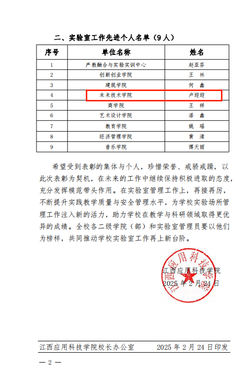 近日,学校发布了《关于表彰2024年学校实验室工作先进集体、先进个人的决定》。我院荣获2024年度实验室工作先进集体,学院教务科副科长卢迎迎荣获2024年度实验室工作先进个人。